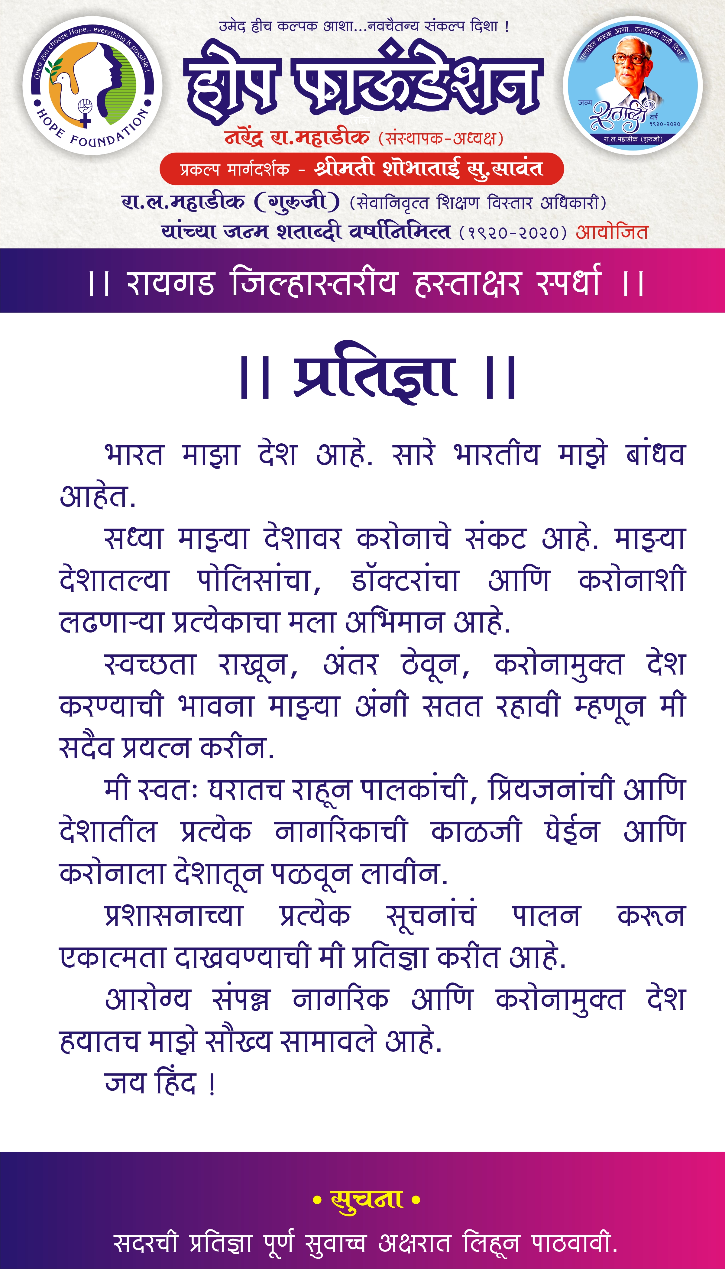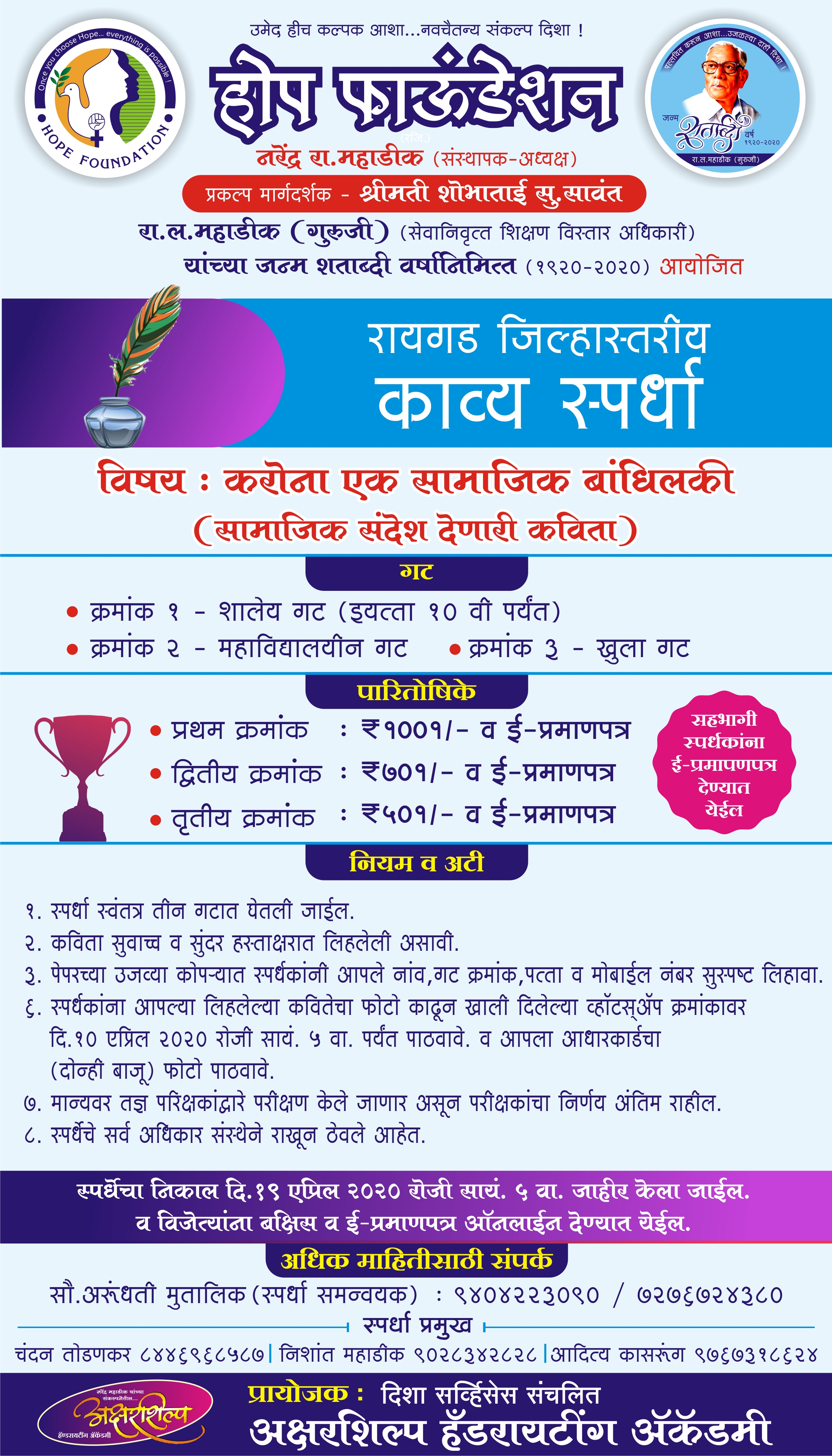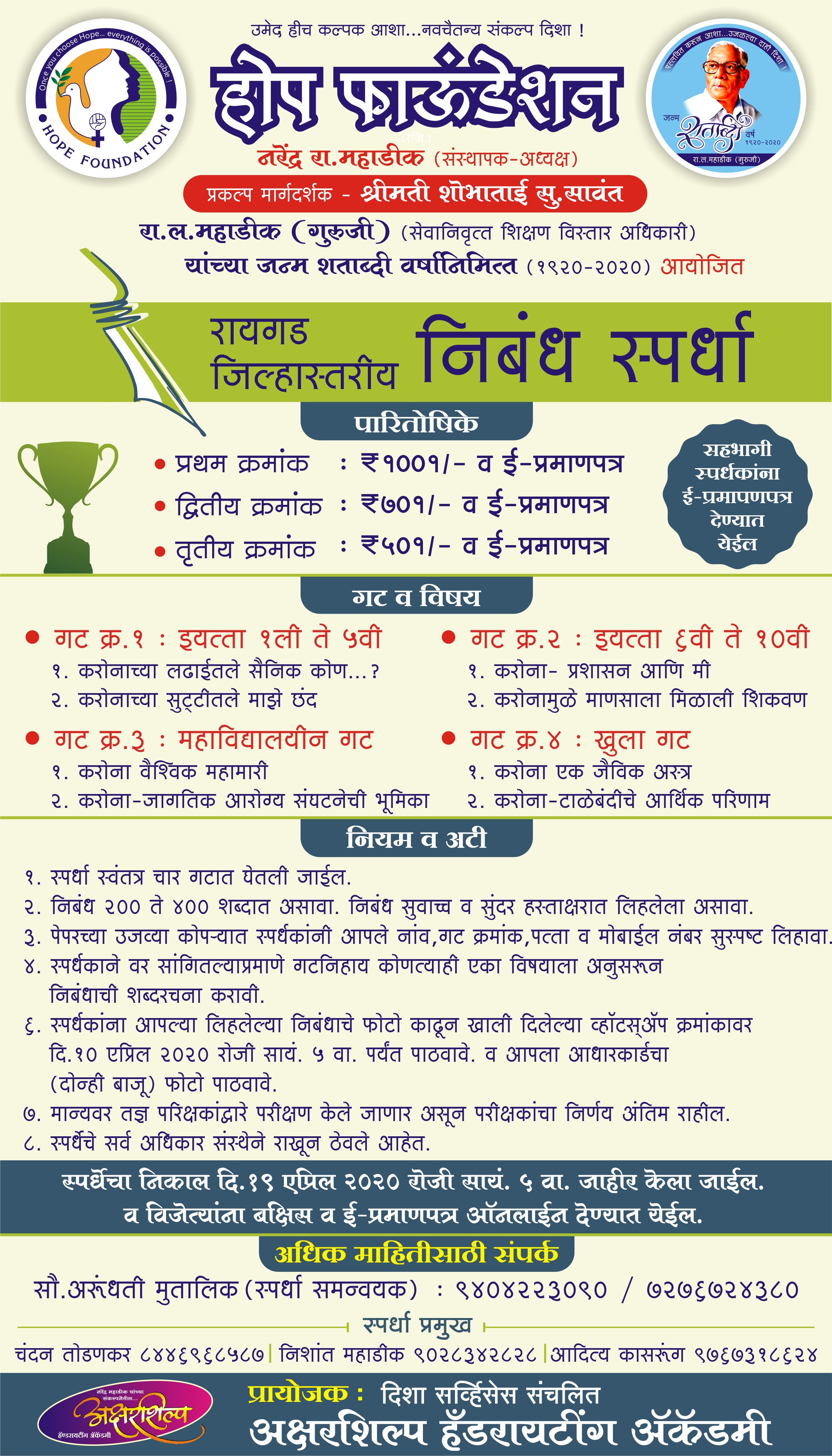 In period of COVID-19 to encourage people of all categories we held Online Handwriting, Drawing, Essay Writing and Kavya Competition in March 2020 for Raigad District. We had lots of response to this competition.